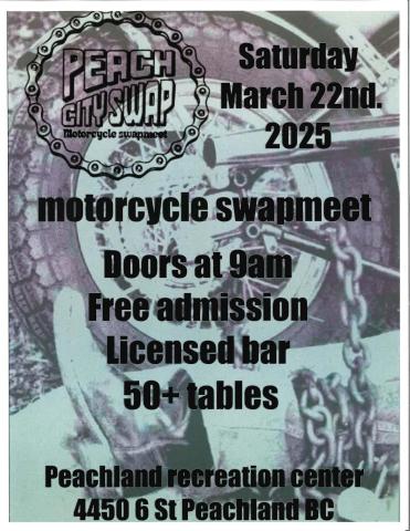 Peach City Swap Meet 9:00 am - 3:00 pm Peachland Community Hall. 4460 6th St. Peachland